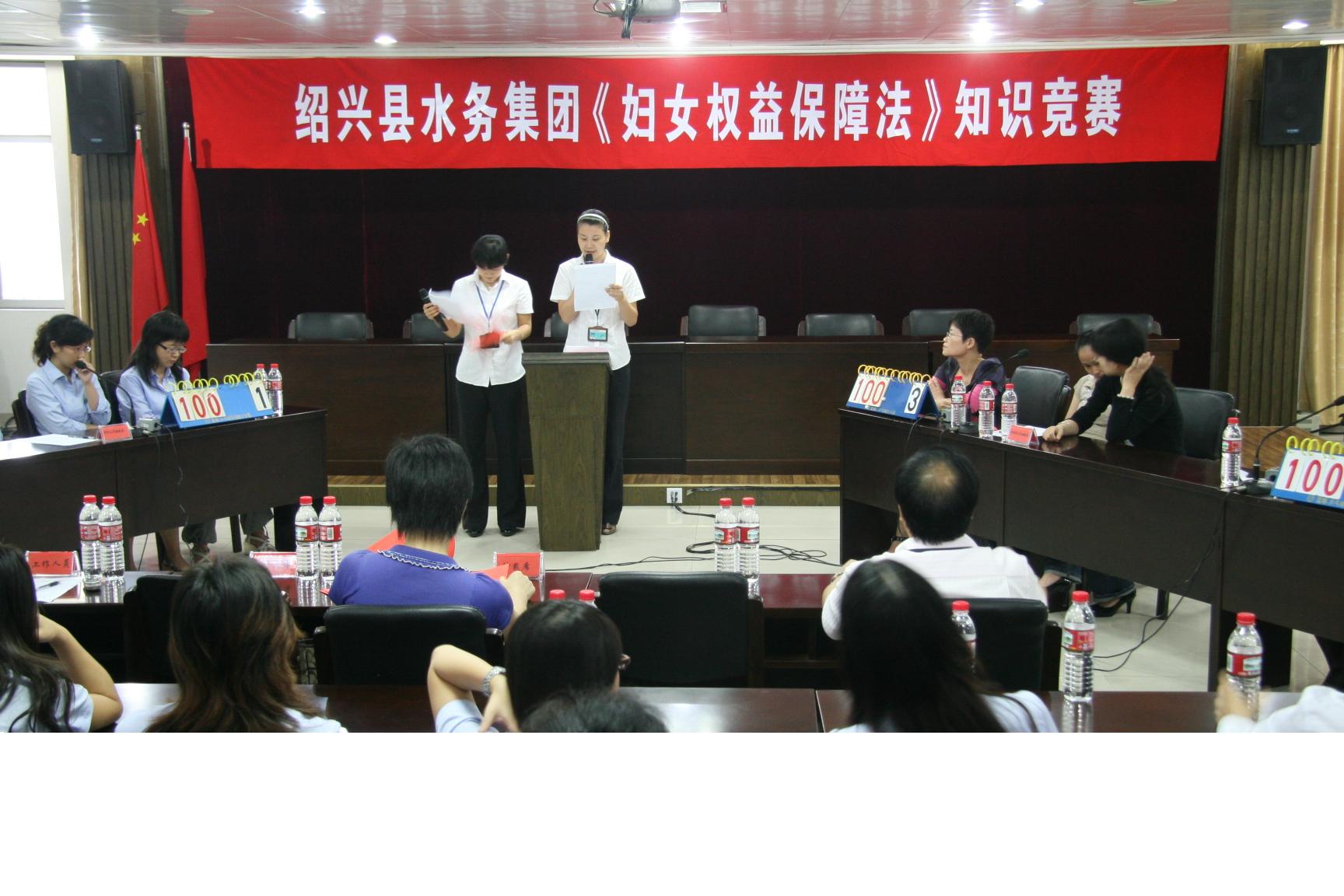 為廣泛深入地學習、宣傳、貫徹《中華人民共和國婦女權益保障法》,提高廣大女職工的法律意識及依法維護自身利益的能力,在“十一”前夕,水務集團婦聯舉辦《中華人民共和國婦女權益保障法》知識競賽。來自集團機關、供水、排水、水處理公司婦委會等4支女職工代表隊參加比賽。本次競賽以現場答題形式,分個人必答題、小組必答、搶答題和風險題?;顒釉诖蠹曳e極踴躍,熱情高漲。經過緊張激勵的角逐,最終水處理婦委會榮獲第一名。
